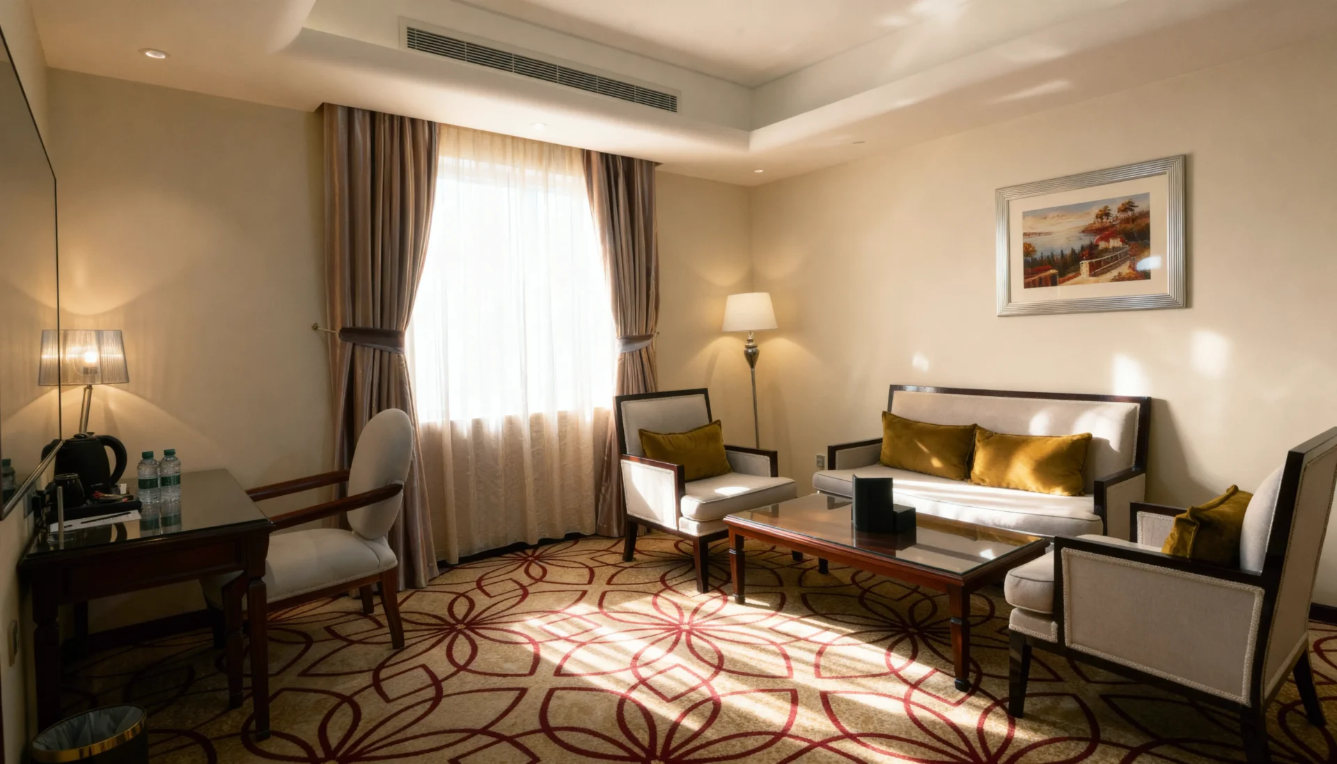 Includes a bedroom and a separate living room with a front view—offering a complete stay experience suitable for business travelers or guests who require private space for meetings or in-suite sessions.